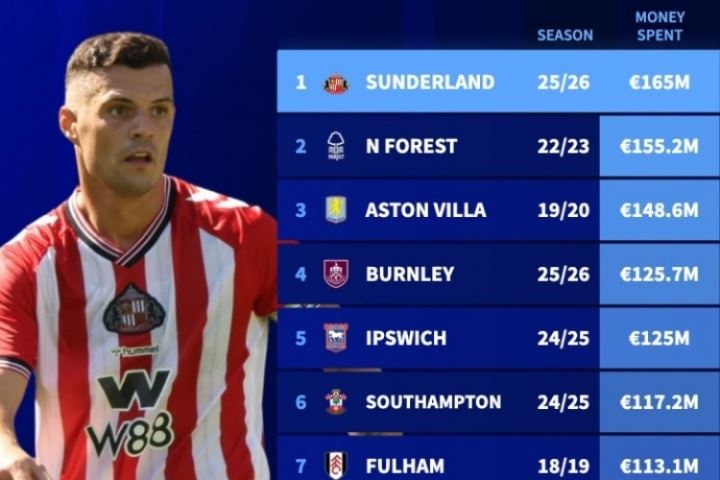 1.65亿欧!德转官方:桑德兰超越森林,成单季花费最多英超升班马