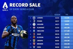 意甲各队最贵转出榜:国米1.13亿欧出售卢卡库居首,博格巴次席