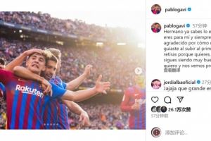 加维社媒晒出与阿尔巴的合照,并写道:“兄弟,你已经知道你对我来说有多么特别,在我升入一线队的时候,你的欢迎和引导让我永远心怀感激。”